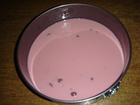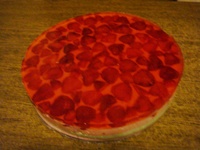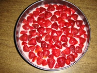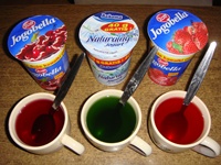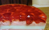 Po wystygnięciu galaretek łączę jogurt wiśniowy z galaretką wiśniową, jogurt naturalny z galaretką agrestową a jogurt truskawkowy z galaretką truskawkową. Na spód tortownicy wyłożonej folią spożywczą wylewam jogurt z galaretką wiśniową i wstawiam do lodówki lub dla szybszego ścięcia na chwilkę do zamrażalnika. Następnie tak samo postępuję z jogurtem z galaretką agrestową. Po ścięciu się kolejnej warstwy wylewam jogurt z galaretką truskawkową i od razu układam kawałki truskawek. Wkładam do lodówki. Gdy jogurt truskawkowy się zetnie wszystko zalewam kolejną galaretką truskawkową.