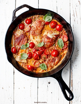 Filety znów przewrócić, wlać śmietankę wymieszaną z pesto i pokrojonymi na połówki pomidorkami koktajlowymi, zagotować. Gotować przez ok. 2-3 minuty aż pomidorki zmiękną a sos stanie się gęsty (zbyt gęsty sos można rozcieńczać wodą np. z gotującego się makaronu).