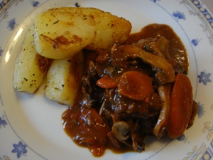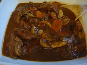 Pokrojony w patyczki bekon podsmaż na oleju (2-3 minuty, aż lekko zbrązowieje), wyjmij, przełóż do garnka żeliwnego lub szklanego żaroodpornego. Na tym samym, ale bardziej rozgrzanym tłuszczu podsmaż wołowinę partiami, aż zrobi się lekko brązowa po bokach. Odłóż ją do naczynia z bekonem. Na tym samym tłuszczu podsmaż marchewkę i cebulę pokrojone w plasterki i dorzuć do reszty składników (bez tłuszczu pozostałego na patelni). Rozgrzej piekarnik do temp. 230 st. Podsmażone składniki posyp solą, pieprzem i mąką. Wstaw garnek bez przykrywki do piekarnika na 4 minuty. Zamieszaj mięso i podpiecz je jeszcze przez 4 minuty, by nabrało brązowej, chrupiącej skorupki. Zmniejsz temperaturę do 160 st. Dodaj wino i bulion (mięso ma być ledwie przykryte), przecier, czosnek, listek laurowy. Kiedy bulion z winem zacznie bulgotać, przykryj garnek pokrywką i piecz całość przez 2,5-3 godziny. Podawaj z gotowanymi ziemniakami, makaronem lub ryżem, przystrojone grzybami, skarmelizowanymi cebulkami i posiekaną pietruszką.