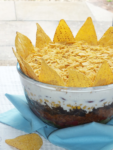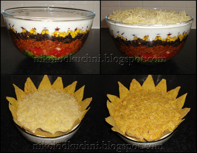 Wymieszany jogurt wylej na fasolę, posyp startym serem. Na około powtykaj całe chipsy, a wierzch posyp pokruszonymi.