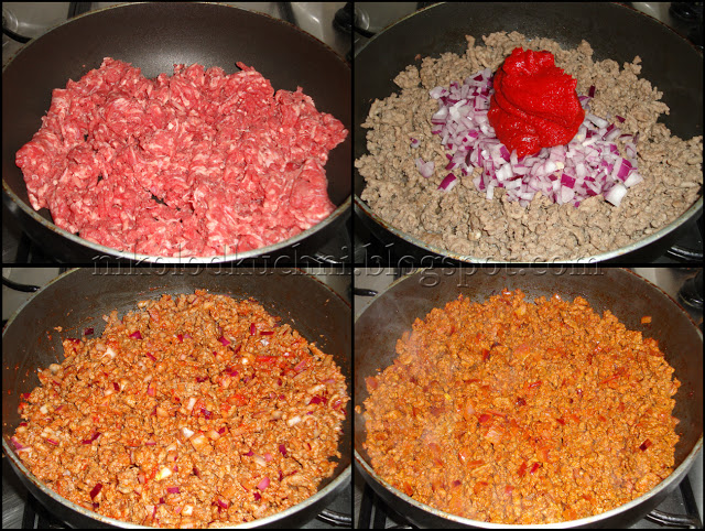 Cebulę drobno posiekaj. Mięso mielone usmaż. W połowie smażenia dodaj cebulę i koncentrat pomidorowy. Dopraw solą i pieprzem.