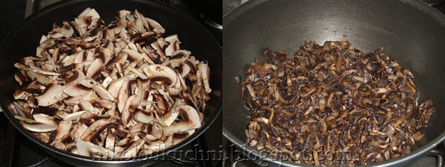 W międzyczasie pieczarki pokrój w plasterki i smaż do czasu aż cała woda odparuje.