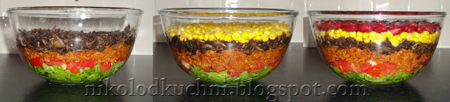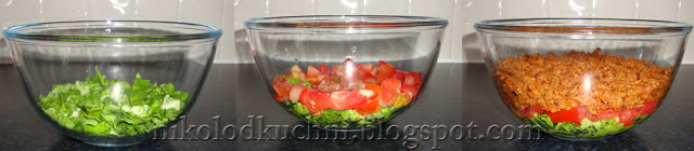 W przezroczystej misce układaj warstwy. Sałatę porwaną na kawałki, na nią pokrojony w kostkę pomidor i usmażone mięso.